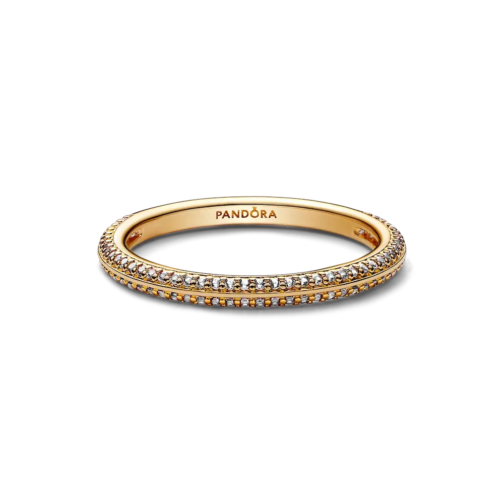 Remix your ring stacks with this Pandora ME Pavé Ring, ready to be styled into fresh metal and color combinations that suit your mood every day. This 14k gold-plated ring has been pavé set with 86 micro bead-set clear cubic zirconia for a radiant look. Embrace the ultimate level of personalization by connecting this statement stacking ring to your other faves using the Pandora ME Three-ring Openable Link, then add up to three mini dangle charms that express who you are. Mix and match colors and stones next to each other to give your stacks a glow up. Ready to re-style your ring stack? Follow a few simple steps to make sure your three favorite pieces detach with ease, so you can remix your look over and over. Whatever ring stack you’re rocking, ensure that the Pandora ME Three-ring Openable Link’s openable part faces upwards and slide only one of the rings to the opposite side. Next, take off any mini dangle charms through the opening, one at a time, before removing the other rings. You’re now ready to change it all up again!