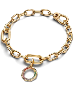 Energize your look and your vibe with the Pandora ME Rainbow Medallion Charm. Crafted in our 14k gold-plated unique metal blend, this octagon-shaped charm features a rainbow-hued row of sparkling stones in green, pink, light blue, dark blue, red, purple, orange and yellow on one side. On the other side is an engraved message that reads: