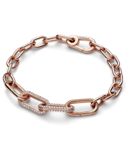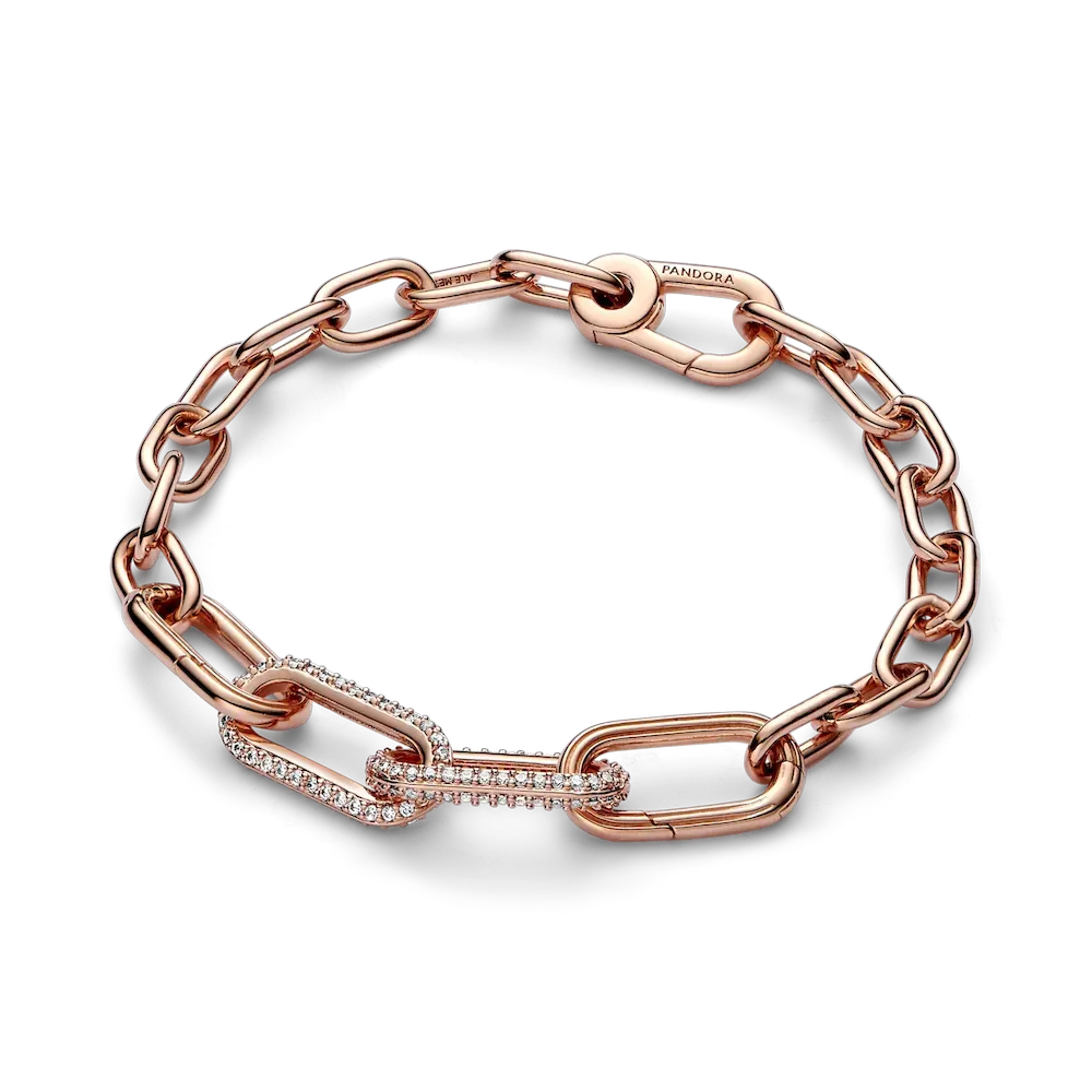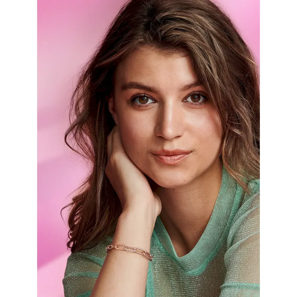 Give your chains a glow up with this Pandora ME Styling Pavé Double Link. Hand-finished in 14k rose gold plating, this piece is made of two interlocking links set with two rows of round brilliant-cut clear cubic zirconia. Wear yours between openable links on your Pandora ME link chain bracelets or necklaces, or hang it on a pair of hoops for a unique statement. Styling tip: the length of a double link matches the length of two regular links, four small interlocking links or one styling link – for easy personalisation.