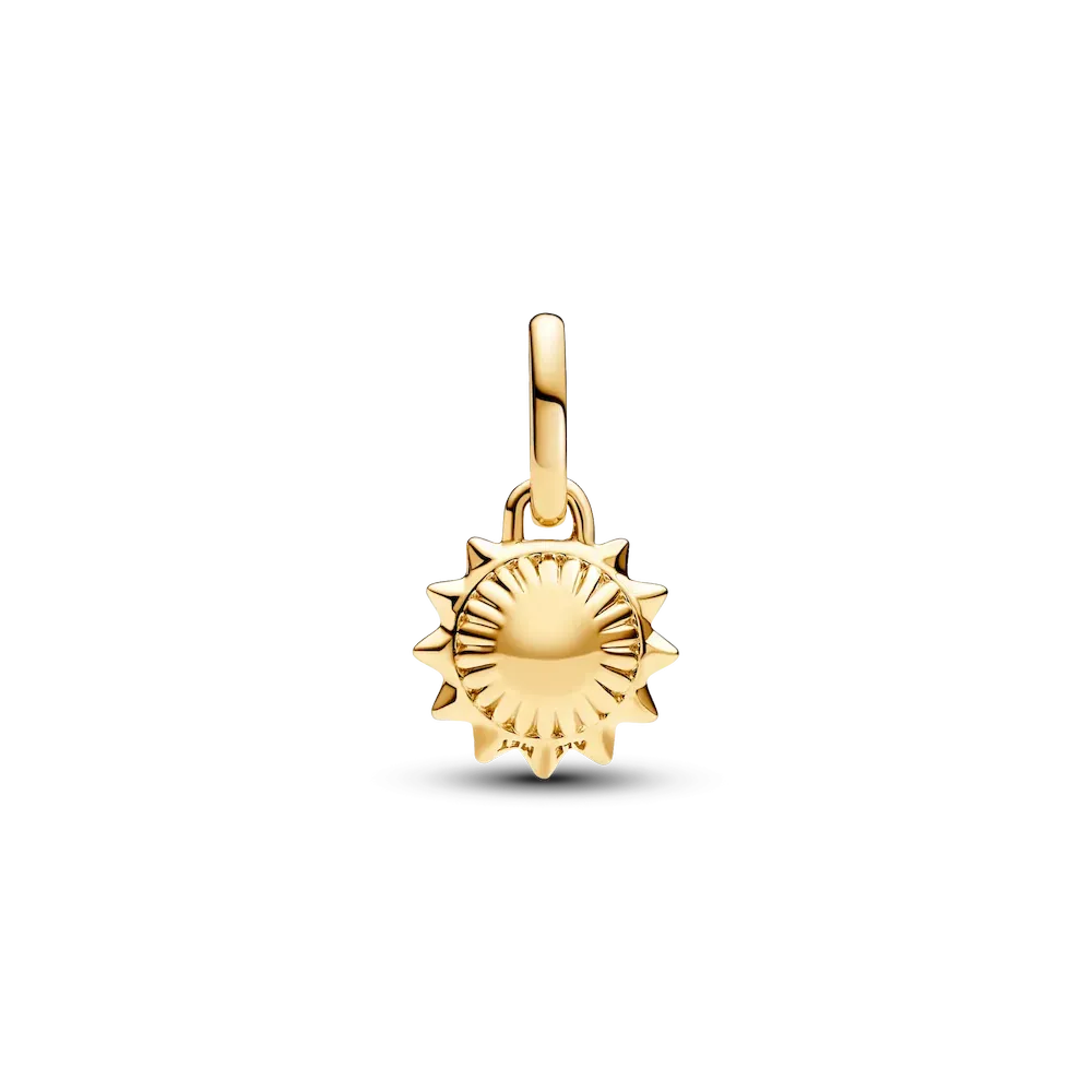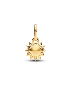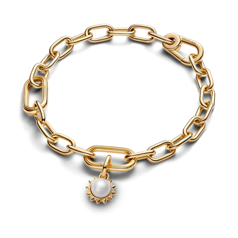 Be a one-of-a-kind with the Pandora ME Treated Freshwater Cultured Pearl Sun Mini Dangle Charm. This sun-inspired 14k gold-plated mini dangle charm centres on a treated freshwater cultured pearl surrounded by pyramid-shaped rays. The reverse side features a domed metal sun and grooved detailing. In much the same way as the real sun provides us all with warmth and energy, this sun charm will be a symbol of life, light and renewal for you whenever you wear it. Compatible with Pandora ME and Pandora Moments.