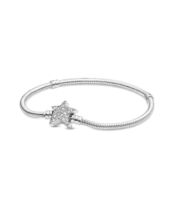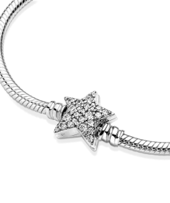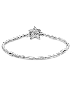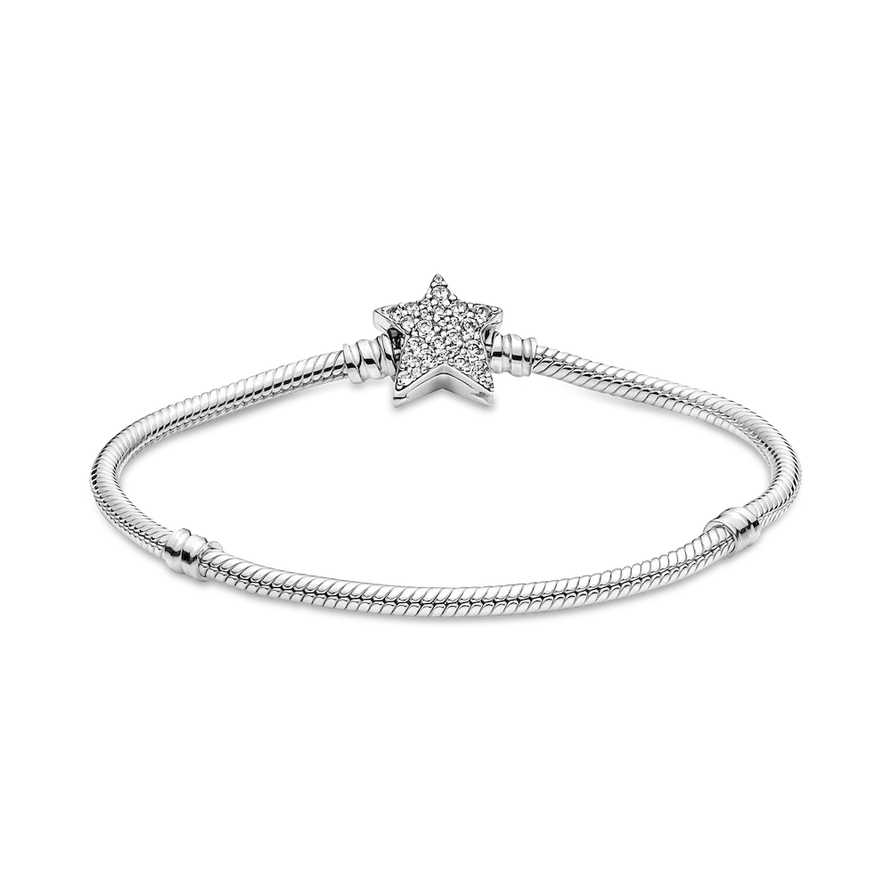 Bring celestial sparkle to your look with the Pandora Moments Asymmetric Star Clasp Snake Chain Bracelet. Hand-finished in sterling silver, the bracelet’s star-shaped clasp is covered by sparkling clear cubic zirconia pavé on both sides. It can be worn with up to 16-18 desired charms and clips. Wear it on its own for a simple, understated look, or stack it with other celestial-inspired designs for a look that’s out of this world.