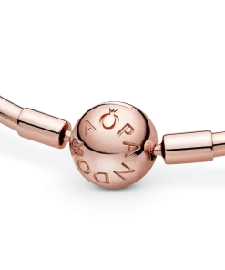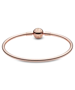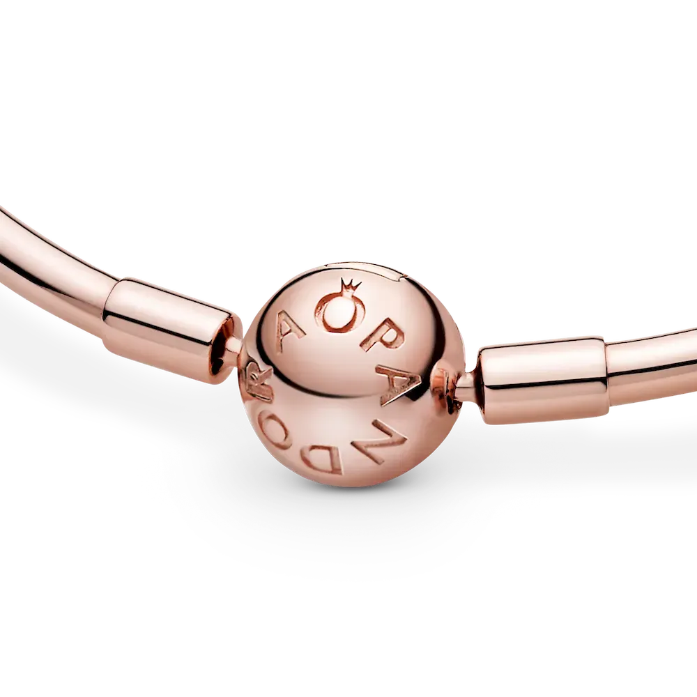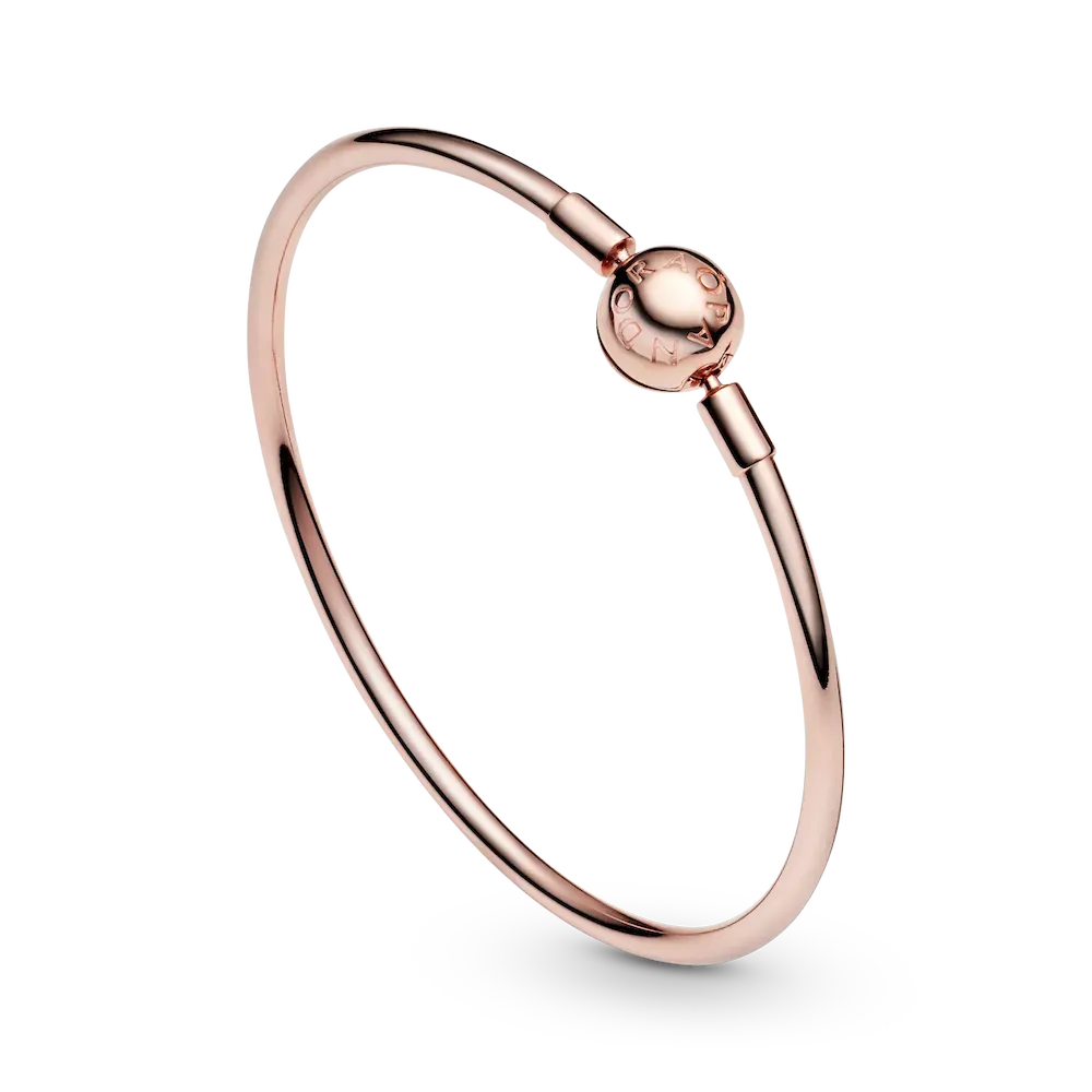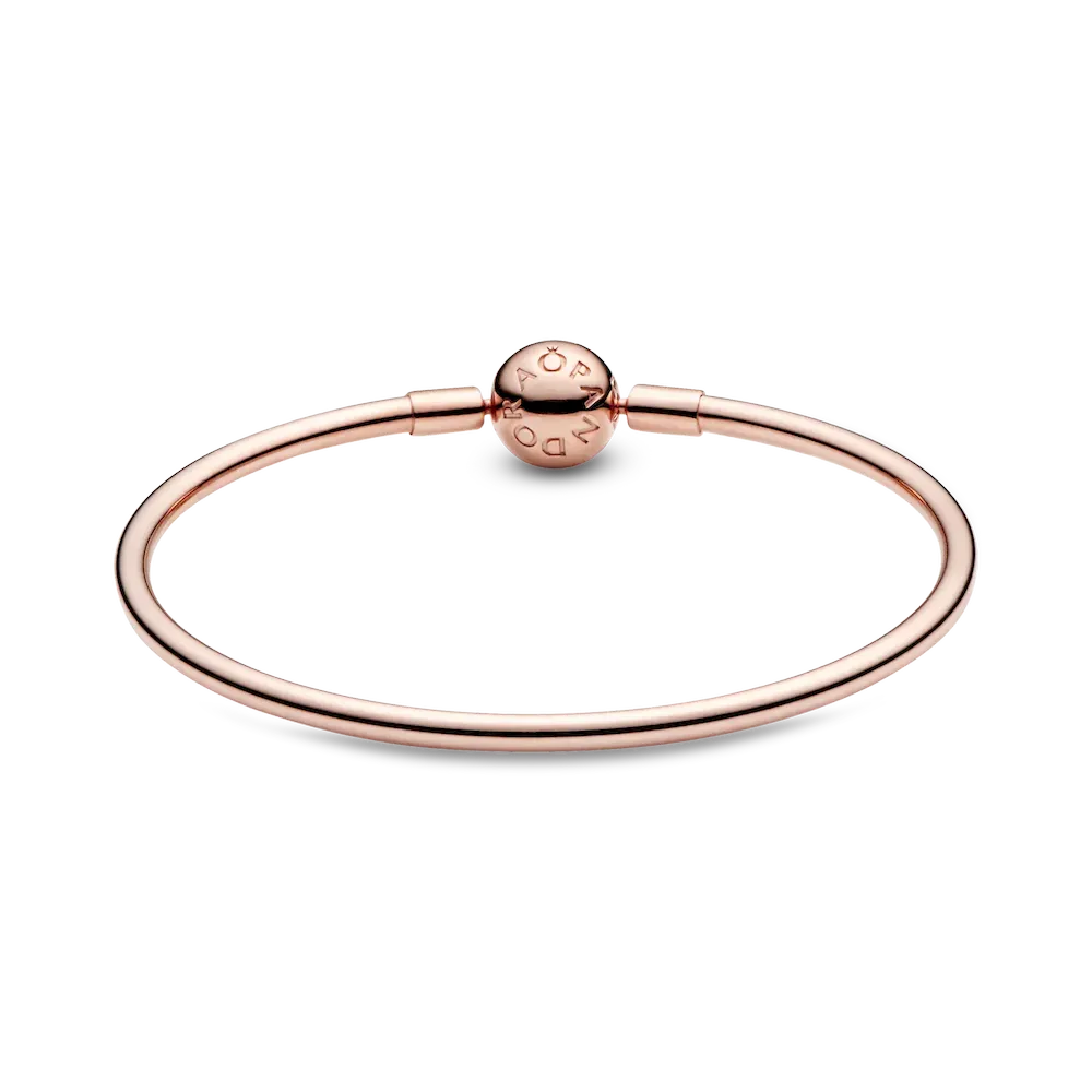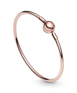 The simple things in life often are the greatest gifts. Like this minimalist Pandora Moments Bangle, carefully plated with 14k rose gold. The sleek style is stamped on the ball clasp with our logo – a subtle way to channel the trend. Adding polished edge to any look, try using silicone-lined clips to space out charms or dare to bare and wear it solo.