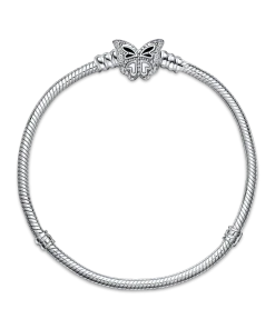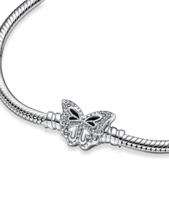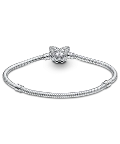 Tell your spring story and be inspired by the season of transformation with our sterling silver Pandora Moments Butterfly Clasp Snake Chain Bracelet. Cut-out and raised heart details and sparkling bead-set round brilliant-cut clear cubic zirconia give depth and dimension to the butterfly’s wings. Style up to 18 charms on the bracelet and carry spring moments with you wherever you go. Pair it with other sterling silver pieces, like our Blue Butterfly Hoop earrings.