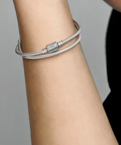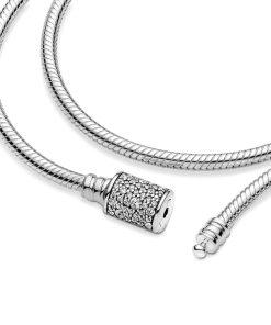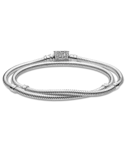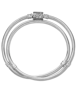 Double the style on your wrist with the Pandora Moments Double Wrap Barrel Clasp Snake Chain Bracelet/Necklace. This sterling silver double wrap bracelet features a snake chain pattern and a barrel clasp embellished with clear cubic zirconia pavé. The bracelet has four threaders, allowing for endless styling possibilities: Unwrap it to style it as a necklace or wear it as a bracelet and load it up with your favorite charms (it can fit up to 18 to 25).