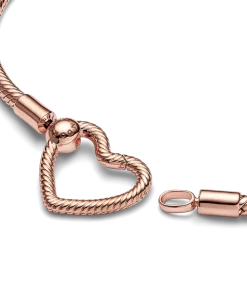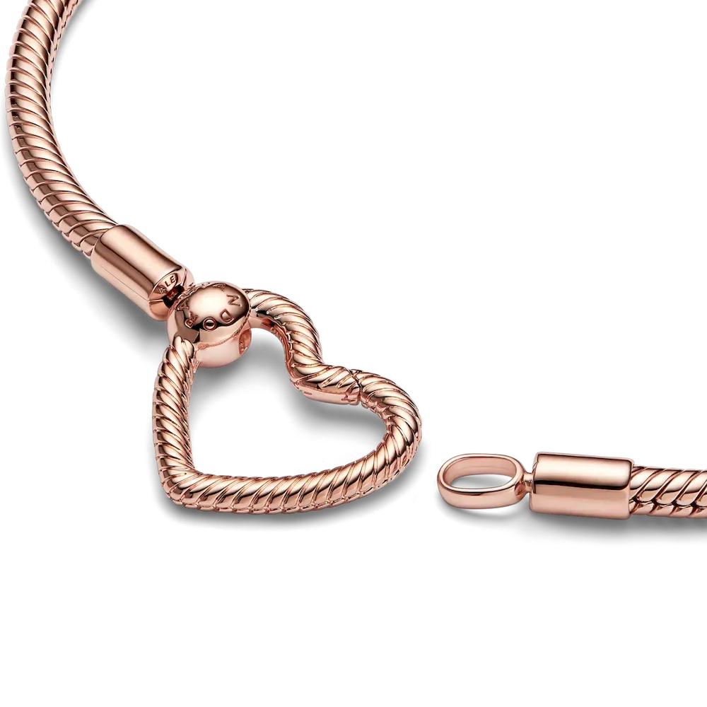Update your style story with a symbol of love, with our Pandora Moments Heart Closure Snake Chain Bracelet. Hand-finished with 14k rose gold plating, this fresh take on a much-loved design features Pandora’s iconic snake chain pattern and a heart-shaped closure. The closure can hold up to two dangles or pendants and spins for a touch of dynamic movement. Style this iconic bracelet with your favorite charms and create a personalized look.