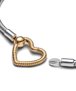 Add a symbol of love to your styling with our Pandora Moments Heart Closure Snake Chain Bracelet. This fresh take on a much-loved design features Pandora’s iconic snake chain pattern in sterling silver and a heart-shaped closure hand-finished with 14k gold plating. The closure can hold up to two dangles or pendants and spins for a touch of dynamic movement. Style this bracelet with your favorite charms and tell your story in two tones.