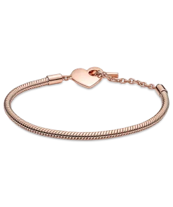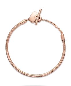 Add a warm-toned accent to your look with the Pandora Moments Heart T-Bar Snake Chain Bracelet. Hand-finished in our 14k rose gold-plated unique metal blend, this piece is an updated take on the Pandora Moments snake chain bracelet. Featuring a heart-shaped T-bar double circle closure, loop the T-bar through the smallest circle to guarantee that the bracelet clasp is securely closed. Wear this sleek, modern style with up to 10-13 Pandora Moments charms and dangles.
