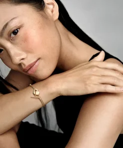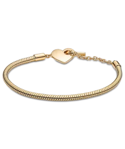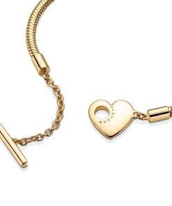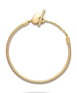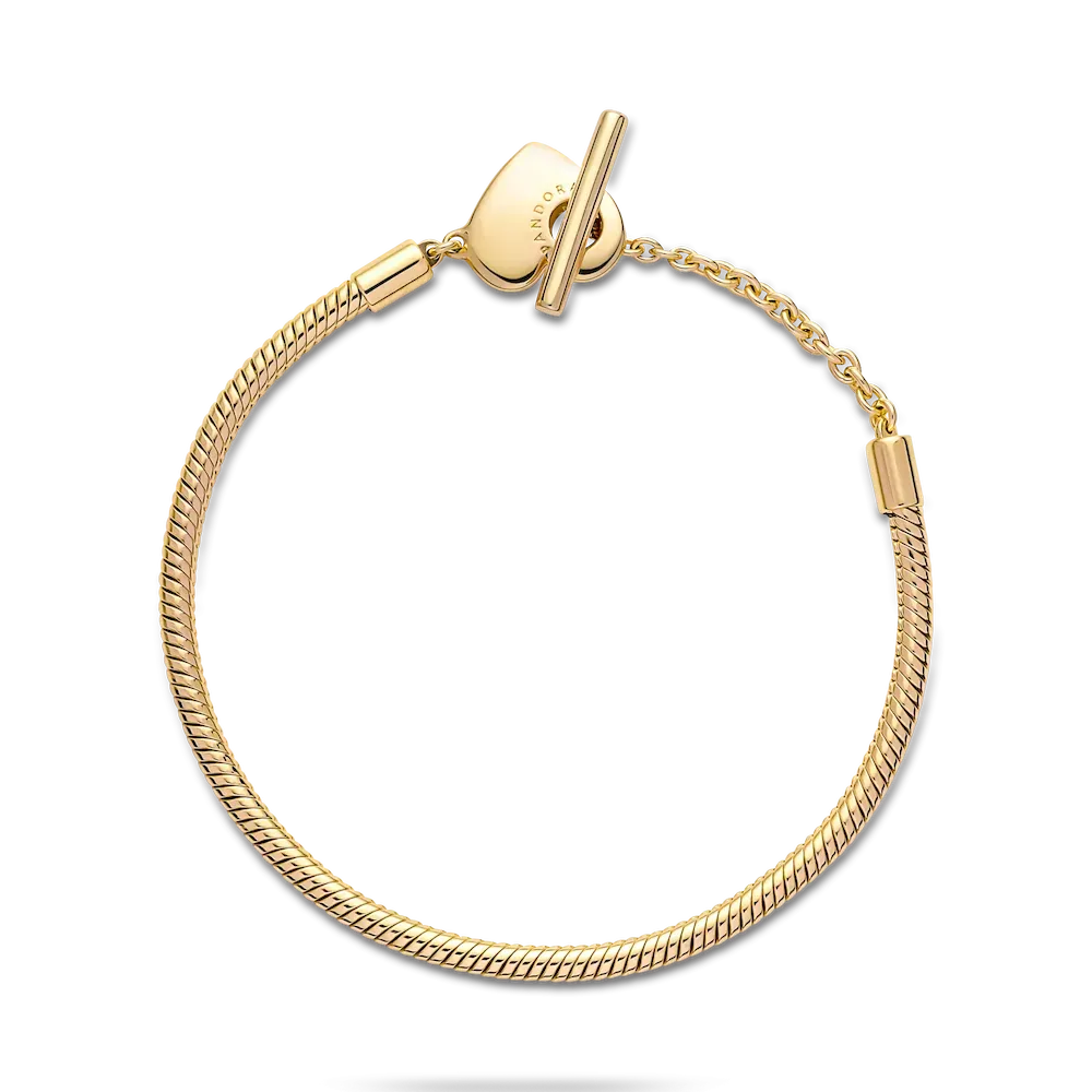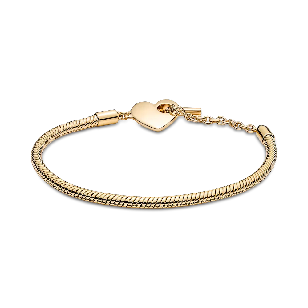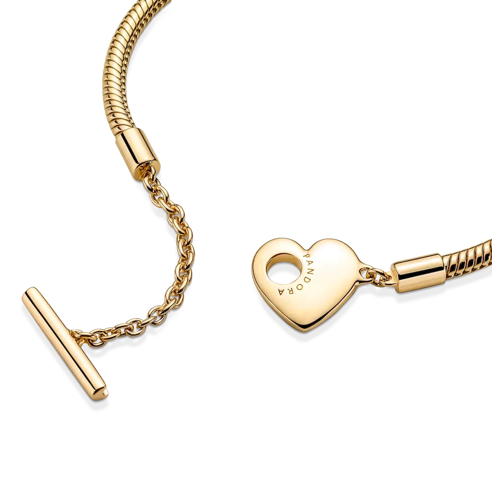 Add a personalized touch to your loved one’s collection with the Pandora Moments Heart T-Bar Snake Chain Bracelet. Hand-finished in 14k gold plating, this piece is inspired by our classic Pandora Moments T-bar snake chain bracelet. The style features a heart-shaped disc with an open circle on one side to loop the T-bar through to open and close, while the reverse polished side is engravable. Designed to be styled with 10-13 charms, include your very own personal message for a heartfelt finish.