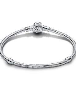 Capture the feeling of romance with our Pandora Moments Rose in Bloom Clasp Snake Chain Bracelet. Crafted in sterling silver, the bracelet is more than a jewelry style, it’s an expression of love. The intricately designed rose clasp with its layered petals adds a touch of floral elegance and symbolism. Versatile and stylish, it accommodates 16-18 charms, divided by functional threaders that allow you to space out your charm collection. Wear it as a reminder of the love you have in your life or gift it to someone you care about.