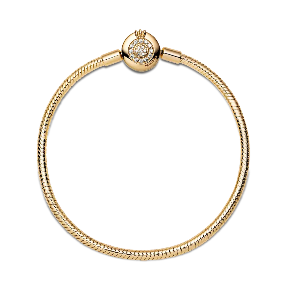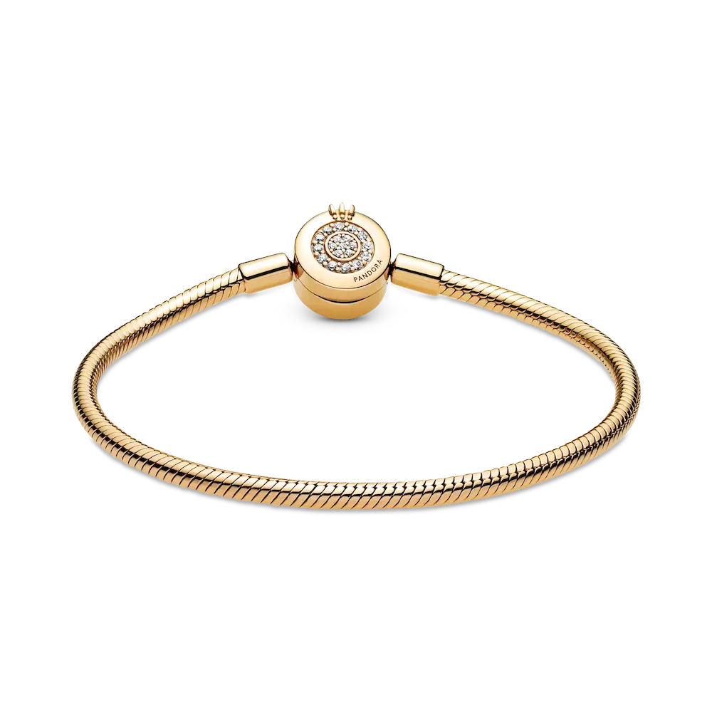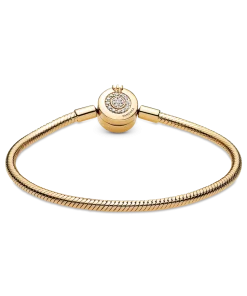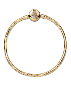 Bring some sparkle to every moment with the Pandora Moments Sparkling Crown O Snake Chain Bracelet. Hand-finished in 14k gold plating the bracelet’s clasp features the iconic Pandora crown O monogram and sparkling clear cubic zirconia pavé, while the snake chain brings a chic and modern touch to your wrist. Stack it with other bracelets and load it up with favorite charms for a piece you’ll reach for over and over.