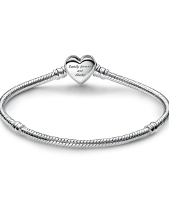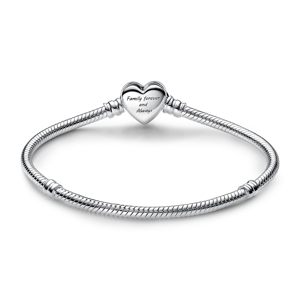 Representing the eternal love that binds family together, the Pandora Moments Sparkling Infinity Heart Clasp Snake Chain Bracelet is a meaningful gift for the ones that matter most to you. The openwork heart clasp features stones along the edge and an asymmetrical infinity symbol entwining around the heart. The back of the clasp is engraved with the message