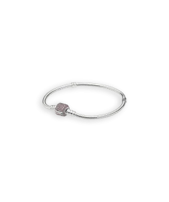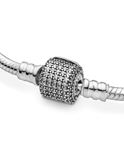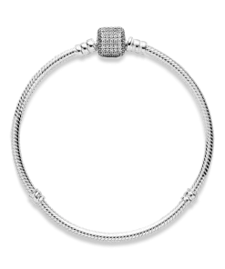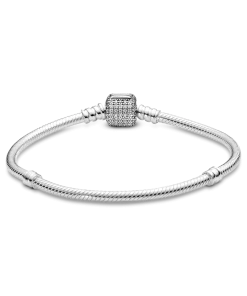 The classic Pandora charm bracelet is given a glamorous upgrade with this sparkling pavé version. Crafted from sterling silver, this sleek snake chain bracelet features a barrel clasp set with sparkling cubic zirconia stones. Wear it solo or as a sophisticated carrier for your personal collection of Moments clips and charms.