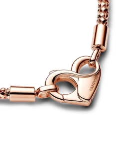 Update your collection with our new Pandora Moments Studded Chain Bracelet in a 14k rose gold-plated unique metal blend. This hand-finished bracelet features a flexible, textured chain and an infinity-detailed openable heart-shaped clasp with an interior infinity symbol. Please note this chain bracelet does not have threaders (raised charm dividers). A maximum of 14-18 charms or dangle charms can be styled on the bracelet. The clasp cannot be styled with charms. We recommend adding charms with silicone grips or safety chains to secure your styling.