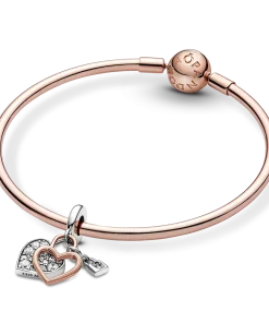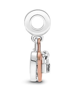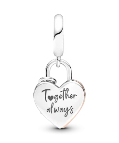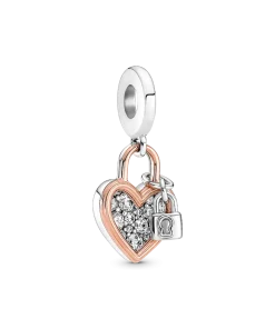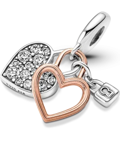 When hearts collide. This romantic set includes a sterling silver studded chain necklace with a flexible, textured chain and an infinity-detailed openable heart clasp that can be styled with up to 4-6 charms or dangle charms. Style it with your favorite charms and any size of Pandora O Pendants. It comes with a heart-shaped double dangle charm features an open heart silhouette in 14k rose gold plating, outlining a sterling silver pavé heart. It is decorated with a tiny padlock, inspired by the love locks that sweethearts place on bridges around the world. On the back heart-shaped disc, the engraving