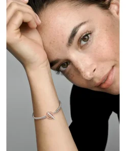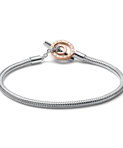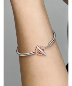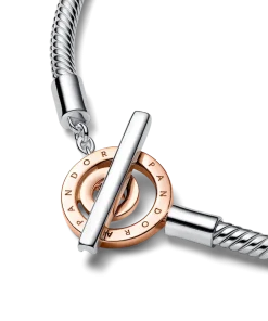 Make a statement with this bold and graphic piece. Inspired by our iconic pendant design, the Pandora Moments Two-tone Logo T-Bar Snake Chain Bracelet features a duo of 14k rose-gold plated circles forming a closure that can spin a full 360 degrees. A sterling silver T-bar attaches to the inner circle to secure the clasp. Add up to 18 of your favorite charms, dangles or pendants and tell your story with your signature style.