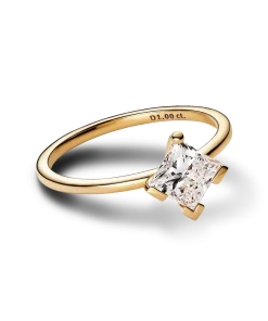 Shine in the Pandora Nova 14k Gold Lab-grown Diamond Ring. Inspired by the illusion of capturing and holding a precious fragment of light, this 14k gold ring showcases a 1.00 carat square princess excellent cut lab-grown diamond. The unique asymmetric prong setting opens the stone to the light for ultimate sparkle. A symbol of the unique light within all of us, this eye-catching lab-grown diamond ring is a piece to be worn and treasured for years to come – by you or someone who brings light into your world. Each Pandora Lab-grown diamond is treated with a post-growth color enhancement called annealing.
