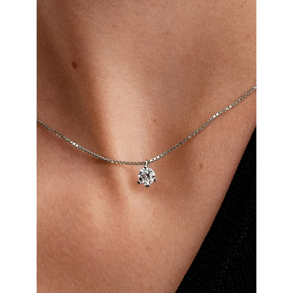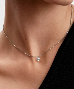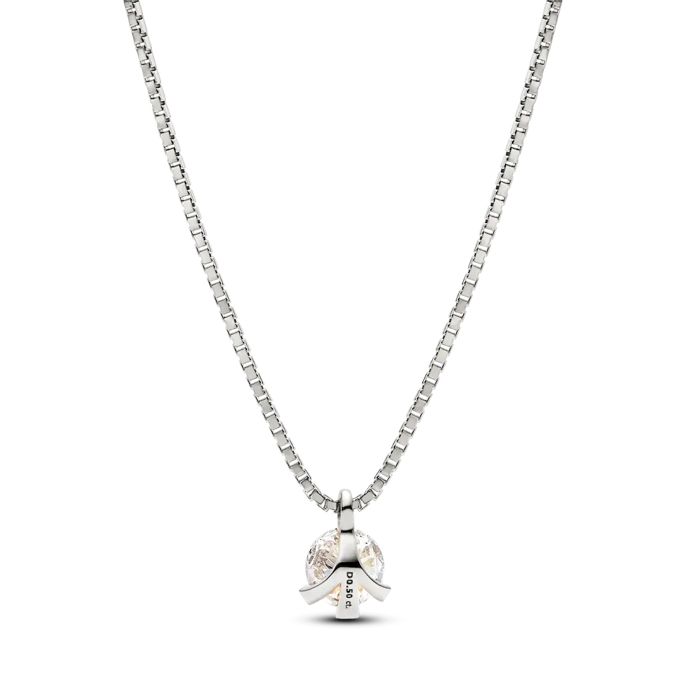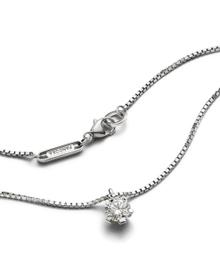 Shine in the Pandora Nova 14k White Gold Lab-grown Diamond Pendant Necklace. Inspired by the illusion of capturing and holding a precious fragment of light, this luminous lab-grown diamond necklace features a 0.50 carat round brilliant excellent cut lab-grown diamond set in 14k white gold. An asymmetrical prong setting frames the stone and is attached to the chain with a hidden jump ring, making the pendant appear to float on the neckline. The 14k white gold necklace chain is adjustable to two lengths. Wear it as a symbol of the unique light within all of us. Each Pandora Lab-grown diamond is treated with a post-growth color enhancement called annealing.