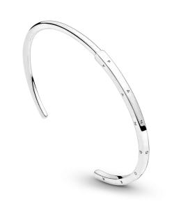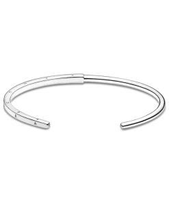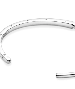 Streamline your look with the Pandora Signature I-D Bangle. With a half-squared, half-rounded profile, this bangle is hand-finished in Sterling Silver. The round polished profile transitions to a larger squared profile in the middle, which features the Pandora logo on its three outer sides. Each end of the bangle includes the Pandora Crown O monogram. The bangle is precisely sized for optimal performance and fit and is not designed to be flexed and twisted when put on and removed.