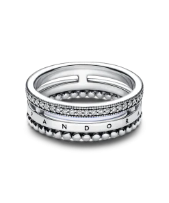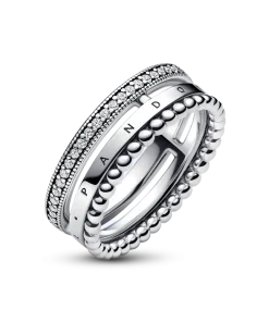 A sophisticated finishing touch to any outfit. Crafted in sterling silver, the Pandora Signature Logo Pavé & Beads Ring features a multi-textured look with contrasting bands of beads and pavé. The Pandora logo is inscribed on the polished middle band. Wear it with the beaded side up or the other way around for a subtle variation to your look.