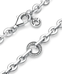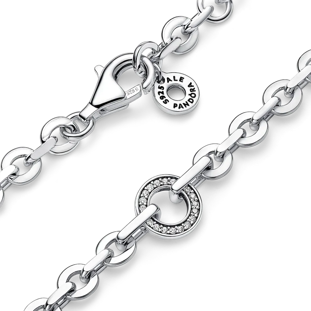 Elevate your signature style with the Pandora Signature Pavé Bold Chain Bracelet. Crafted in sterling silver, the bracelet features a single moveable circular shape in the middle, set with sparkle and microbeads for an eye-catching effect. The link chain is made up of oval and rectangular links for a chunky geometrical look. An essential style in every collection, this easy-to-wear adjustable piece stands out on its own or can be stacked with other chain bracelets.