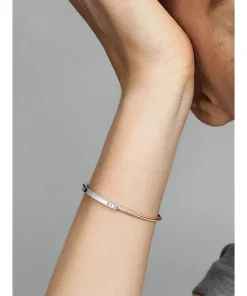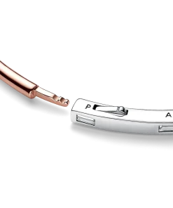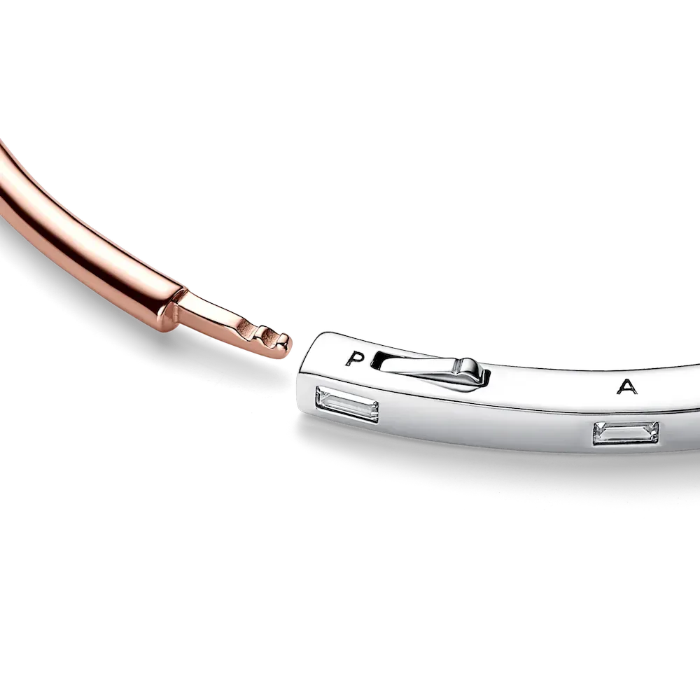 Make minimal stacking your mantra with the Pandora Signature Two-tone I-D Pavé Bangle. The minimalist bracelet is crafted from two metal finishes; sterling silver and a 14k rose gold-plated unique metal blend. The band’s profile transitions from square to round; the squared half features evenly spaced sparkling baguette stones, while the rounded part is warm-toned. The engraved logo on the side corresponds with the placement of the baguette stones. The unique hinge and click closure clasp make it easy to wear and remove this Pandora bangle bracelet. Wear alone as your signature piece, or stack multiple bracelets for a bold look.