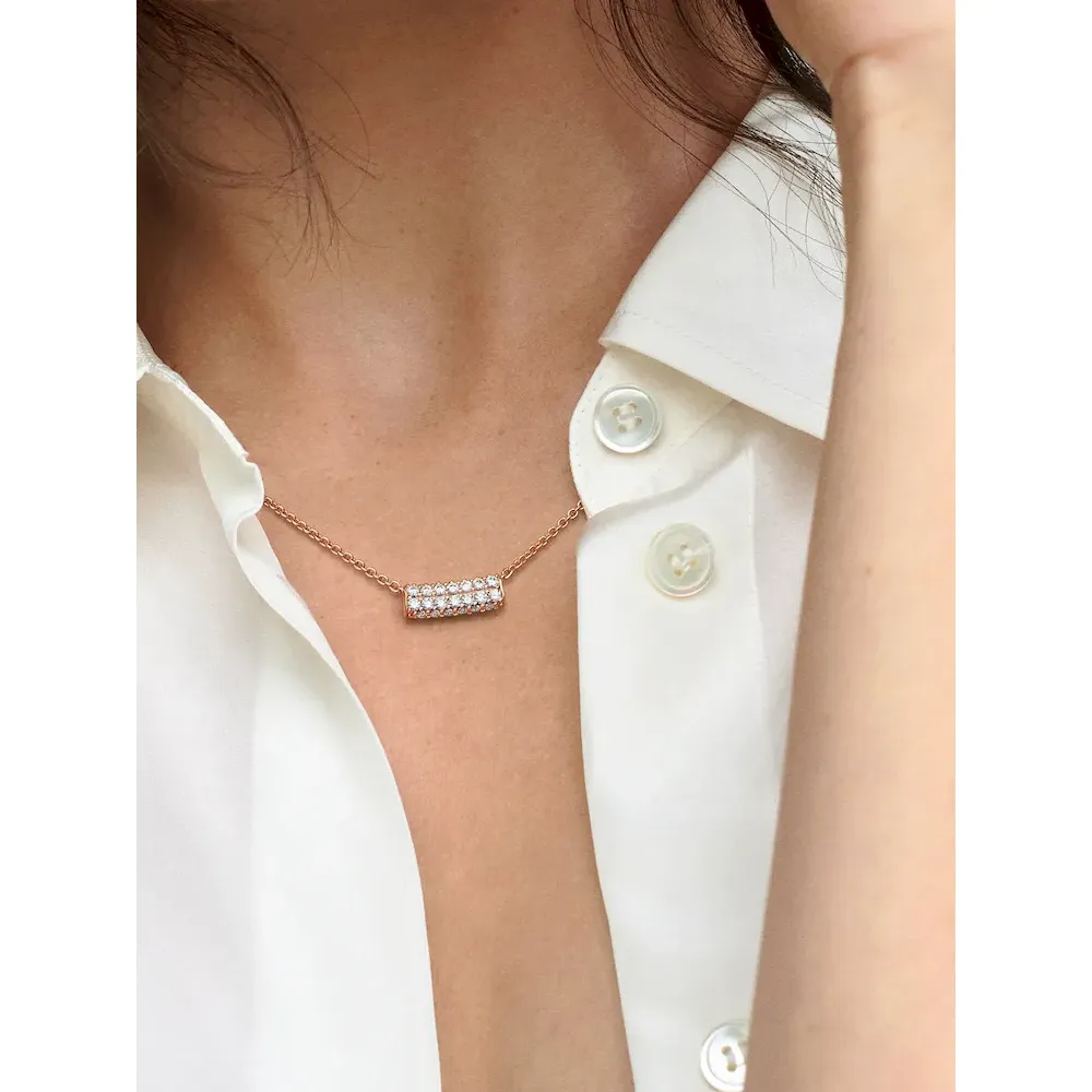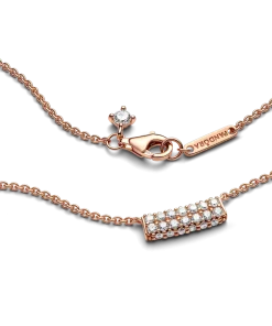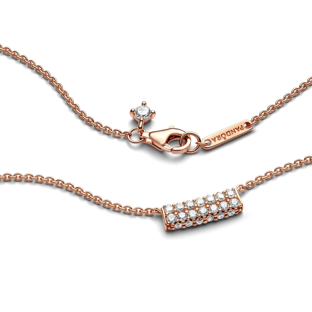Maximize your full sparkle potential with the Pandora Timeless Pavé Double-row Bar Collier Necklace. This versatile piece features a curved bar pendant fixed to the chain with a geometric finish and a double row of sparkle, enhanced with extra rows of stones that face outwards on each side. Add a warm glow with our 14k rose gold-plated finish that offsets the three-dimensional sparkle. Adjustable to two lengths, wear this piece as a statement on its own or layer with more styles for a bold look.
