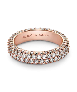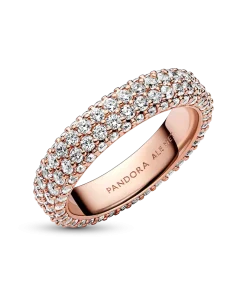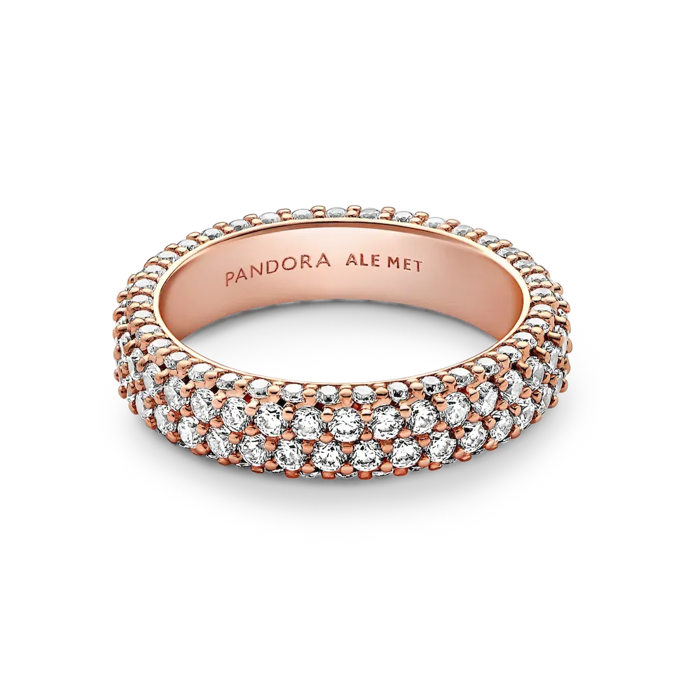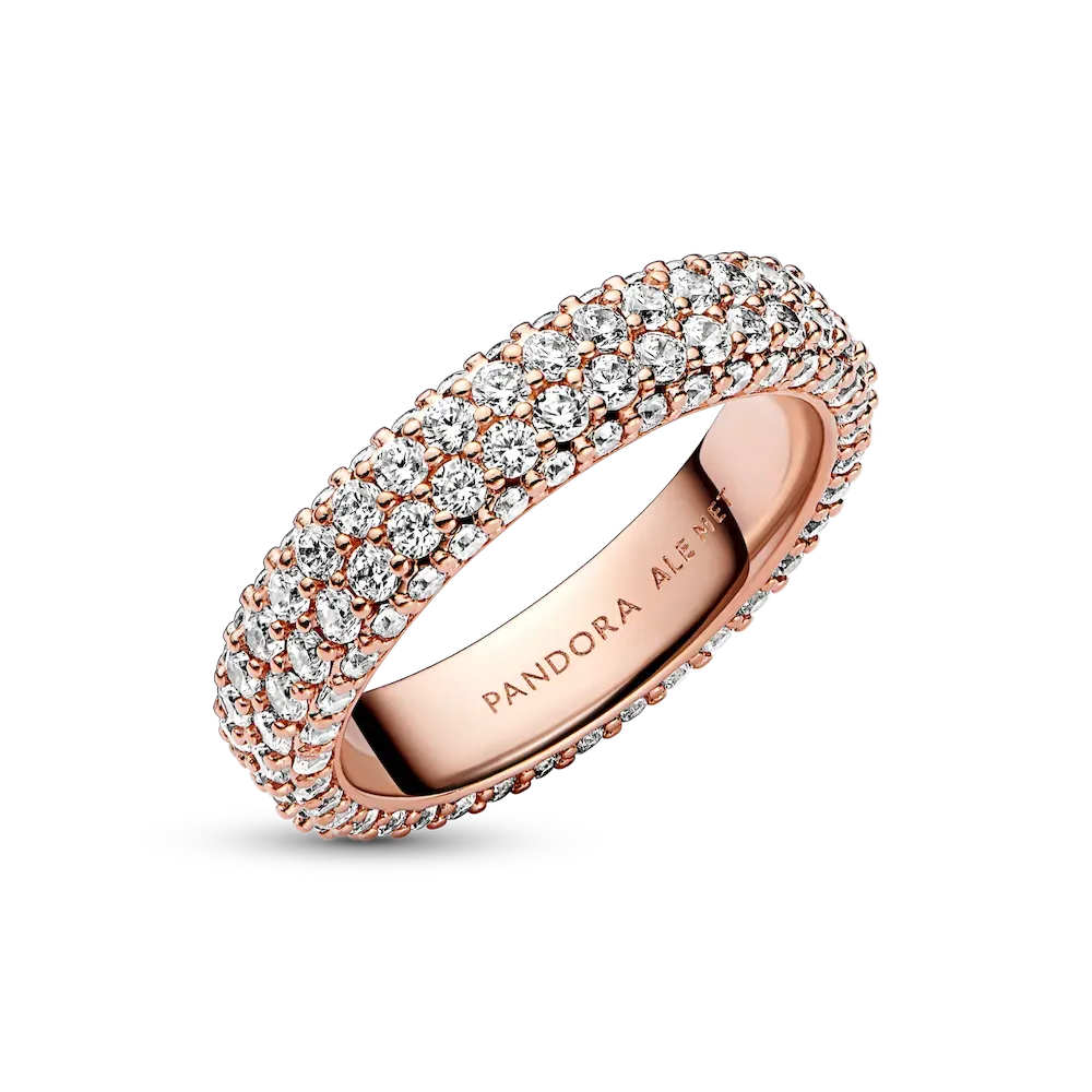 Maximize your sparkle with our Pandora Timeless Pavé Double-row Ring. With warm 14k rose gold plating, this hand-finished ring features two rows of clear cubic zirconia around the centre and one row facing outwards around each side, creating a slightly rounded square profile that sparkles from every angle. Wear it on its own or stacked with other Timeless Pavé rings to create as bold of a look as you want.