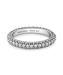 Stackable, radiant, timeless. Crafted from sterling silver, our hand-finished Pandora Timeless Pavé Single-row Ring features one row of clear cubic zirconia around the centre and one row facing outwards around each side, creating a slightly rounded square profile that sparkles from every angle. Style it on its own or with other Timeless Pavé pieces to create as much of a minimalist or maximalist effect as you want.