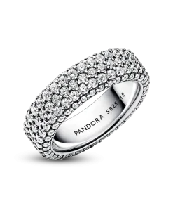 Maximize your sparkle with our hand-finished Pandora Timeless Pavé Triple-row Ring. Crafted from sterling silver, this stand-out ring features three rows of clear cubic zirconia around the center and one row facing outwards around each side, creating a slightly rounded square profile that sparkles from every angle. Wear it on its own or stacked with other Timeless Pavé rings to create as bold of a look as you want.