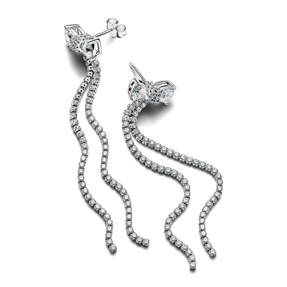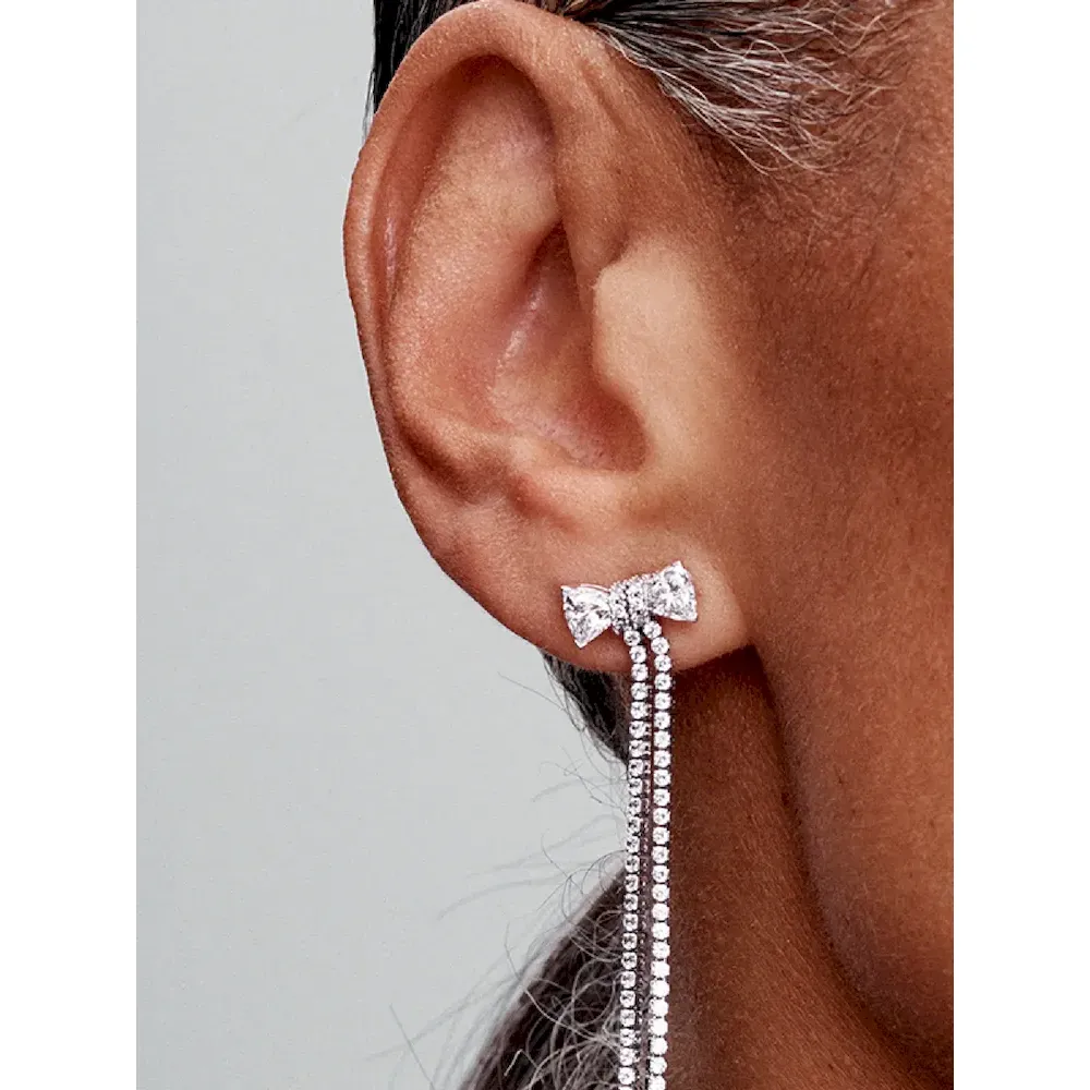 Add a light-filled touch to your look with the Pavé Bow Drop Earrings. Featuring faceted stones that form a bow at the top, this versatile style features a row of sparkling pavé right below for extra sparkle. This eye-catching pair is crafted in sterling silver. Perfect for wearing with minimal outfits as well as on special occasions, the bow is a symbolic motif that always adds something extra to every outfit.