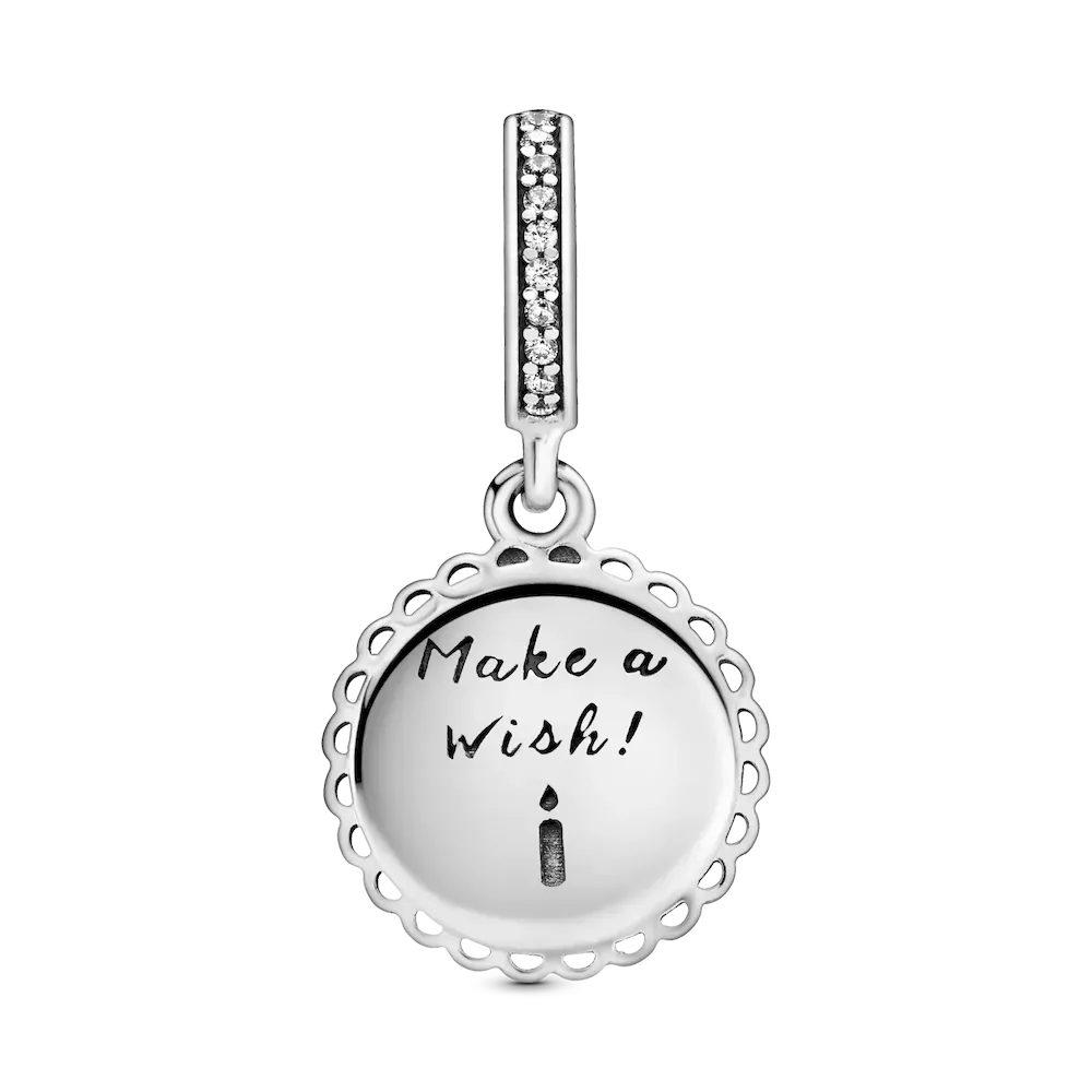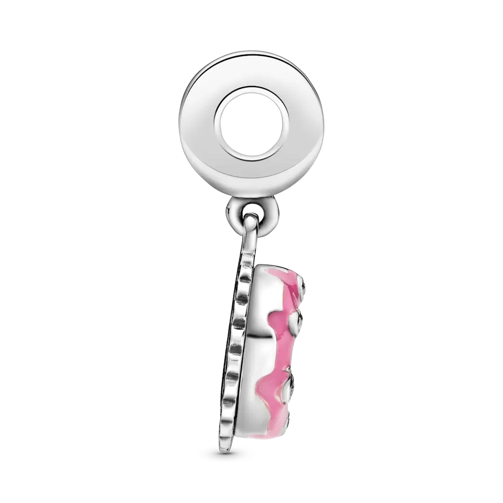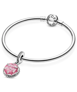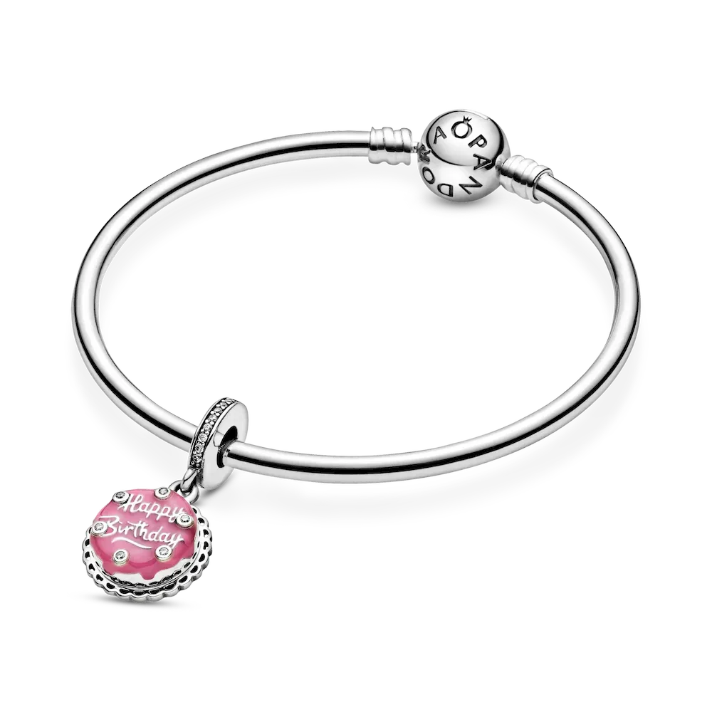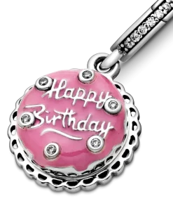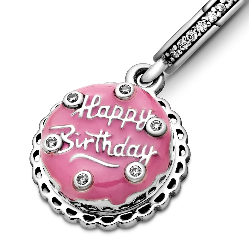 Say “Happy Birthday” with this sterling silver Pink Birthday Cake Dangle Charm. Celebrate the special day with a cake charm that will keep you in festive spirits all year round. The dangle features a hand-applied pink enamel design and clear cubic zirconia dotted around representing candles. The raised “Happy Birthday” script on the front dangle is joined by a candle symbol engraving and the message
