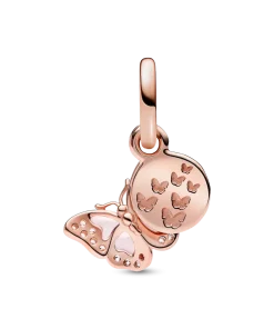 Embrace the change with our Pink Butterfly & Quote Double Dangle Charm. Hand-finished in 14k rose gold plating, it features a butterfly detailed with transparent pink enamel in the heart-shaped cut-outs of each wing and sparkling pavé along the edges. Celebrating the beauty and uniqueness of every butterfly, a round disc is engraved with