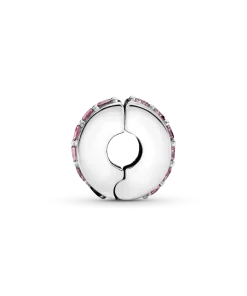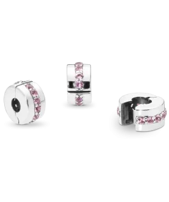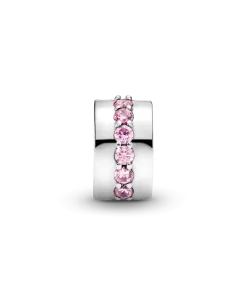 Add a touch of pink. This sterling silver clip charm has a row of pink pavé. This clip charm features no silicone grip, so it will slide if not styled onto threads (two raised charm dividers).