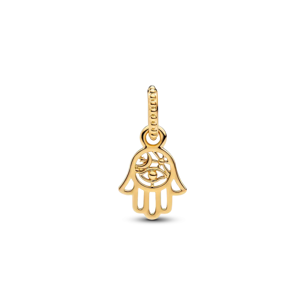 Embrace protection and positivity with this intricate charm, featuring a detailed Hamsa hand with symbolic eye and moon motifs – a meaningful nod to strength and light.