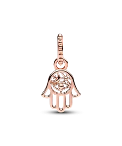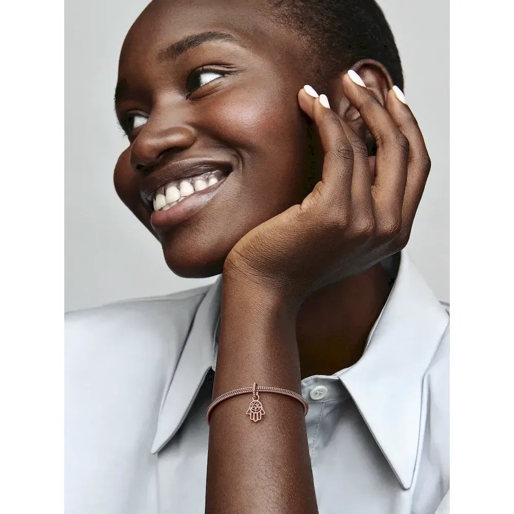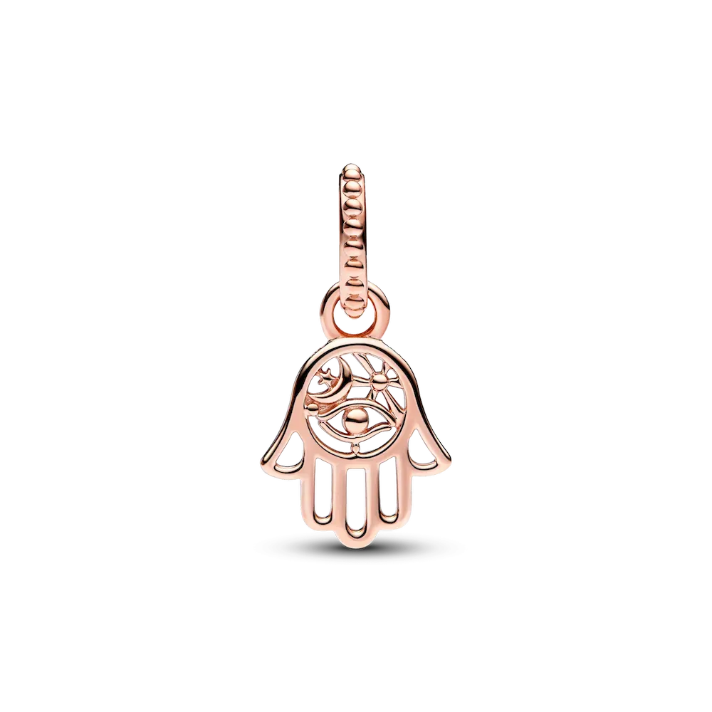 Always channel positive vibes with the Protective Hamsa Hand Dangle Charm. This Hamsa charm features an intricate openwork design in 14k rose gold plating and hangs from a beaded bail. An eye, rays and crescent moon motifs feature inside the hand, which includes one-sided beading along its outline. Traditionally worn as a talisman to defend against evil, the dangling hand is seen as a gesture of welcoming kindness, friendship and grace into your life.