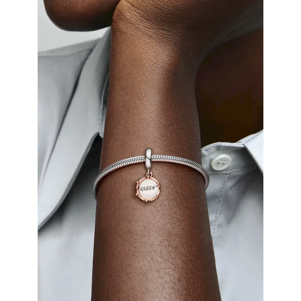 Why be a queen for a day when you can be one for a lifetime with this sterling silver Pandora Moments crown dangle charm? Created in mixed metals with a regal crown detail and a round plaque with ‘Queen’ engraving, the double dangle queen charm lets you stand out as the queen of your world. It also makes a fitting gift for the amazing queens in your life who deserve a crown of their own.