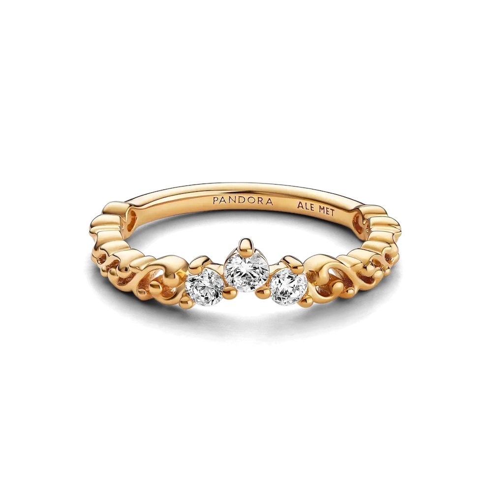 Add a touch of royalty to your everyday looks with the Regal Swirl Tiara Ring. Crafted with a 14k gold plating, this aristocratic piece features a tiara decorated with three sparkling stones and swirling filigree. Crown your hand with this majestic ring and feel like a real queen.