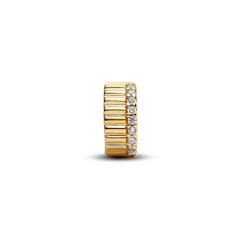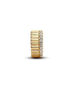 Lock your look in place. This 14k gold-plated clip charm features protective cogs, a row of brilliant-cut cubic zirconia and a hidden silicone grip for added safety — blending craftsmanship with subtle sparkle.