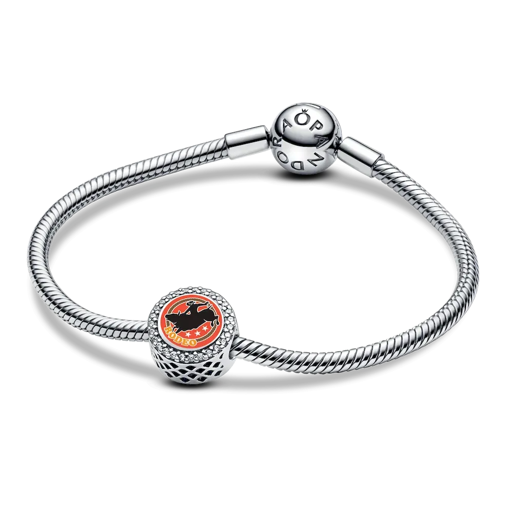 Embrace the energy of the rodeo with the Rodeo Bucking Bull Charm. Hand-finished in sterling silver, this bold design features a dynamic rodeo scene with a rider atop a bucking bull, complete with Rodeo engraved beneath it. Sparkling clear cubic zirconia borders both sides that mirrors the excitement of the rodeo. The reverse side offers space for a custom engraving, allowing you to add a personal touch. A border of hearts along the edge highlights the charm’s rugged yet heartfelt appeal. This piece is a tribute to the thrill and tradition of the rodeo.