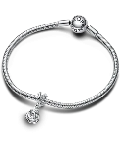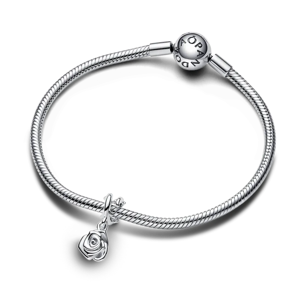 Embrace the symbolism of flowers with the Rose in Bloom Dangle Charm from Pandora Moments. Crafted in sterling silver, this charm showcases a delicate, three-dimensional rose with layered petals that evoke the essence of blooming love. The polished convex back adds a touch of sophistication, while the sterling silver bail, fashioned as the rose’s stem with raised thorns, adds a touch of realism. A symbol of timeless love, this charm captures the classic gesture of gifting a rose with a unique Pandora twist.