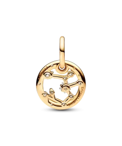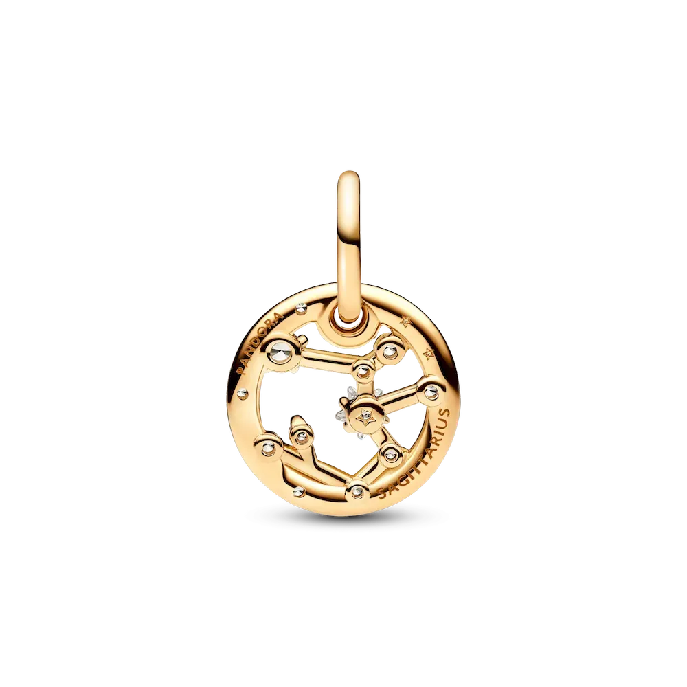 Let the stars guide your look with the Sagittarius Zodiac Dangle Charm. This Pandora Moments dangle charm is crafted our 14k gold-plated unique metal blend, has a circular outer frame and features clear sparkling cubic zirconia as well as the shape of the Sagittarius zodiac sign. The back side of the frame is engraved with