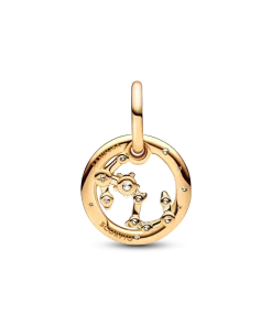 Let the stars guide your look with the Pandora Scorpio Zodiac Dangle Charm. This Scorpio charm is crafted our 14k gold-plated unique metal blend, has a circular outer frame and features clear sparkling cubic zirconia as well as the shape of the Scorpio zodiac sign. The back side of the frame is engraved with