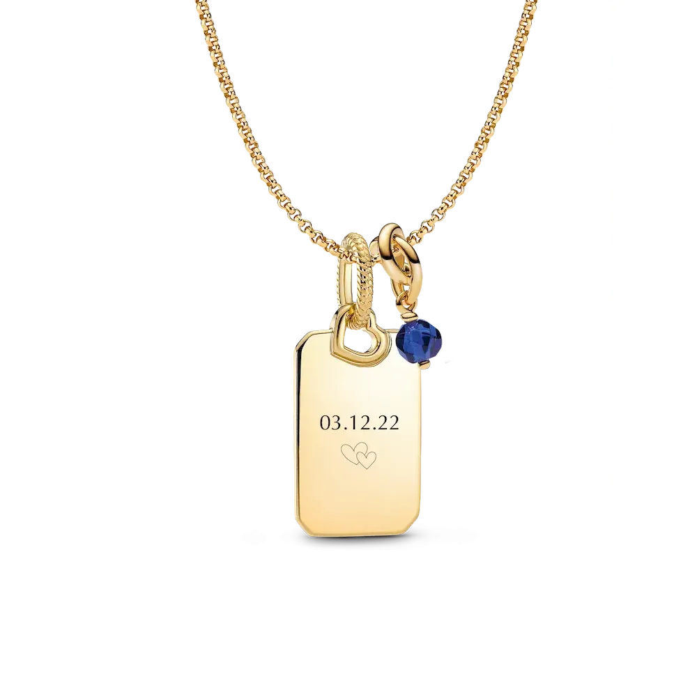 Add a royal touch to your look with the September Engravable Dangle Charm Necklace Set. The adjustable Rolo Chain Necklace in 14k gold plating pairs perfectly with the Engravable Rectangle Tag Pendant, where you can engrave a special message. The September Charm, featuring a princess blue crystal, symbolizes loyalty and strength. The charm’s deep, elegant color adds sophistication to your jewelry collection, making it a perfect addition for those who cherish steady, lasting love.