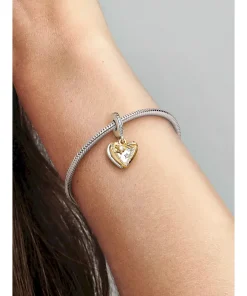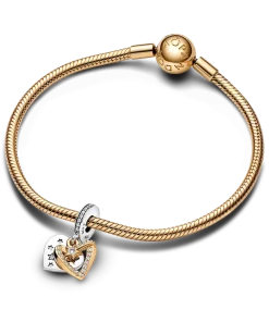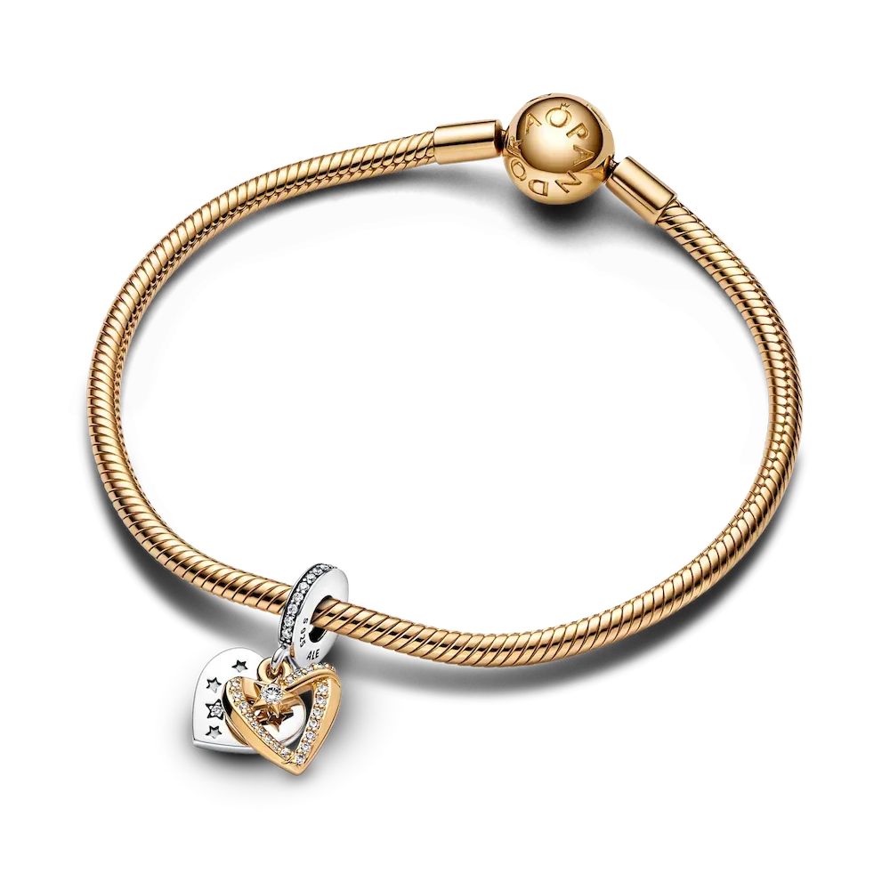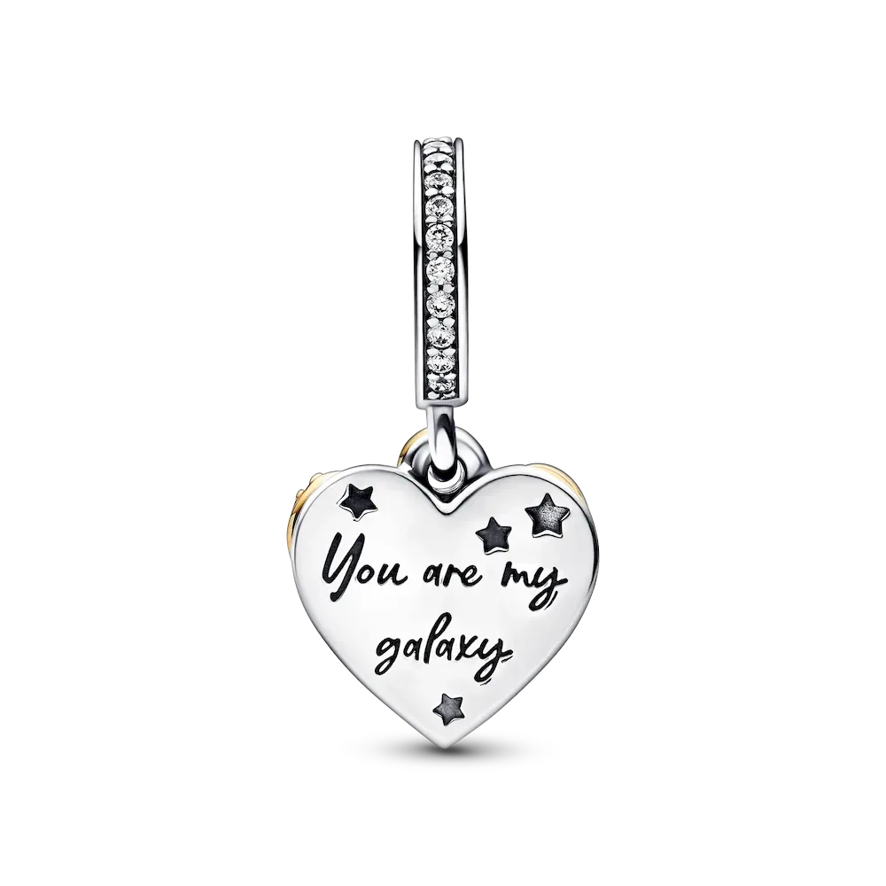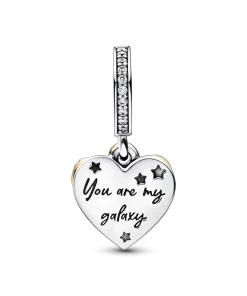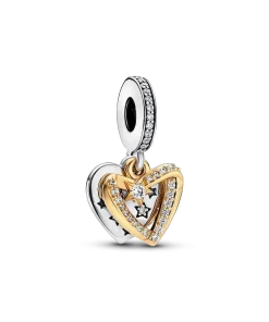 Add a celestial dimension to Chinese Valentine’s Day with our Shooting Star Hearts Double Dangle Charm. This two-tone symbol of heavenly romance features a 14k gold-plated heart, decorated with a constellation of sparkling stars. The second dangle is a sterling silver heart engraved with the message: