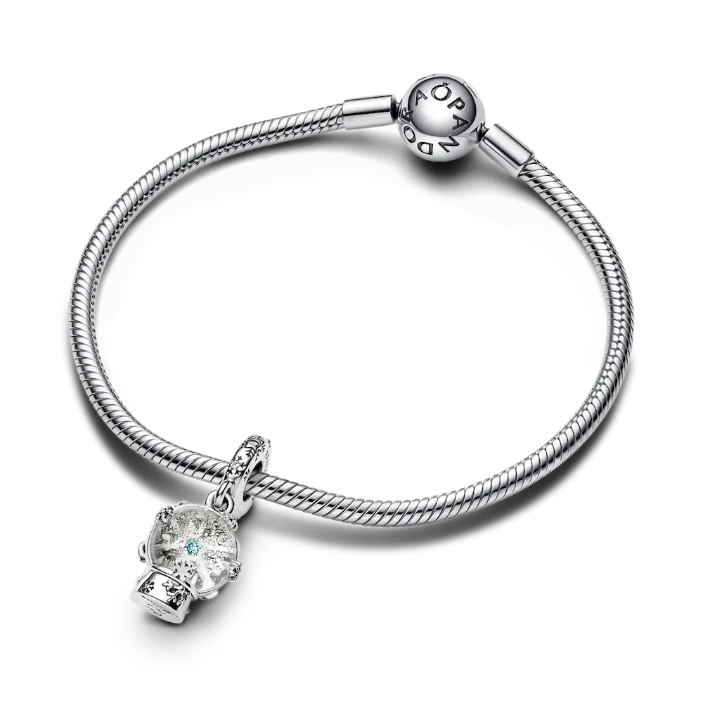 Capture a piece of holiday magic with this Snowflake Snow Globe Dangle Charm. Crafted from sterling silver and Murano glass, this charm features a snowflake motif surrounded by glitter and set within a glass ball, which creates a special, magical feeling. The intricate design requires high levels of craftsmanship to create, as it features lots of details including grooved and raised snowflake shapes on the base, scattered across the snow globe and along the bail. Turn the charm over to find the message