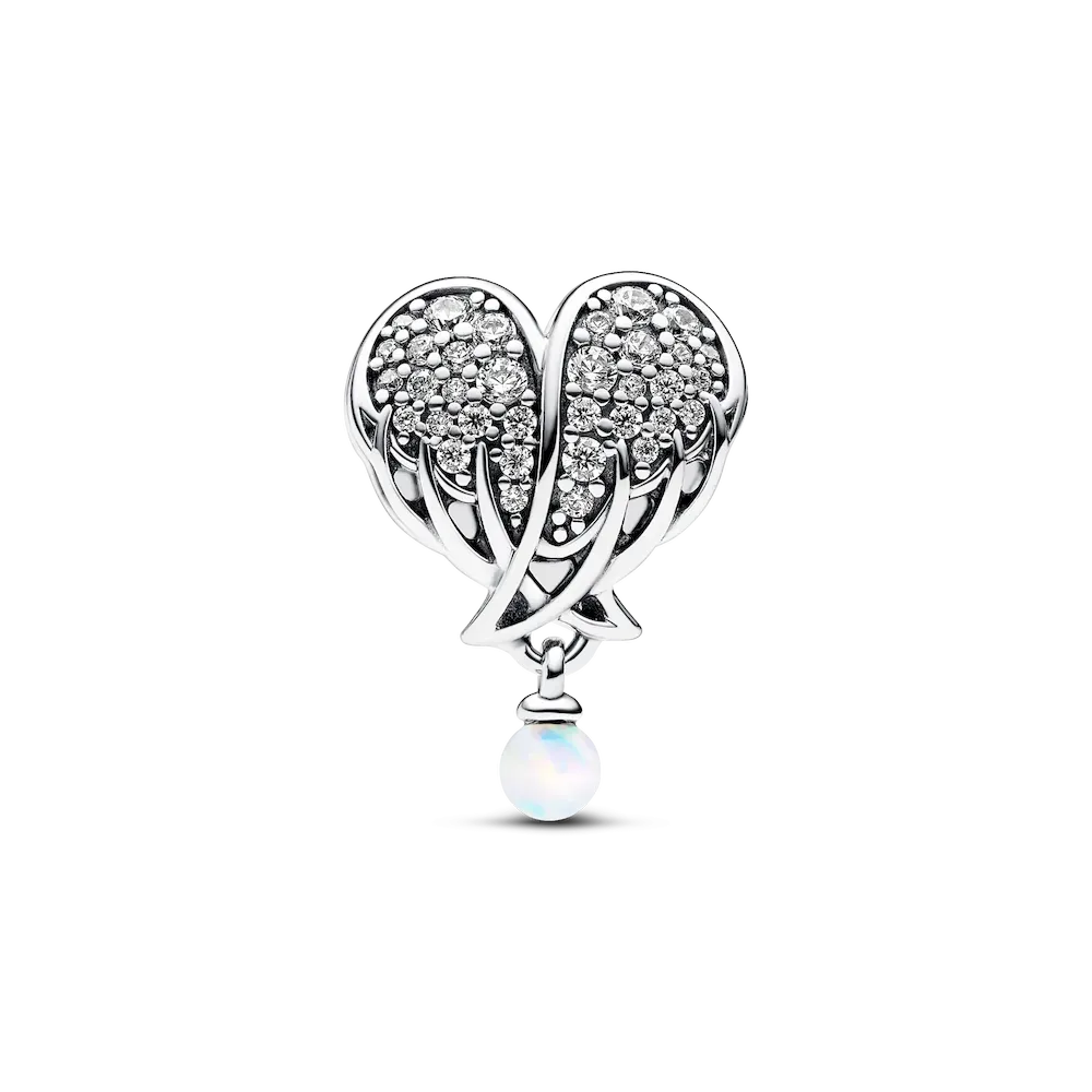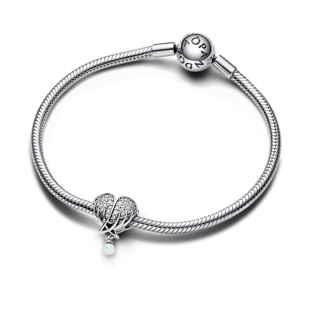 Honor your angels with the Sparkling Angel Wings & Heart Charm. Designed to uplift and inspire, this sparkling addition to the Pandora Moments collection is set with 68 round brilliant-cut clear cubic zirconia stones. A memorable addition to your sterling silver charms, this charm is made even more special with a white lab-created opal dangling from the heart-shaped set of wings. A touching tribute to all the angels who watch over us.