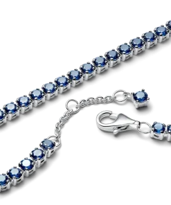 Our reimagined classic tennis bracelet is crafted from sterling silver and features a sparkling row of 34 prong-set round brilliant-cut royal blue man-made crystals. Designed with layering in mind, this is the ultimate piece to add scale and depth to your stacks with its larger stone size. Wear yours as a sparkling statement all season and beyond, or wrap it up as a glittering surprise for the one you love.