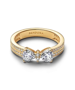 This eye-catching ring features a contemporary bow motif surrounded by cubic zirconia, accented by a double row of pavé stones. Perfect for adding a touch of shine to any outfit.