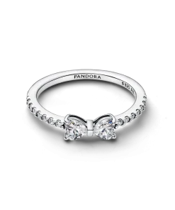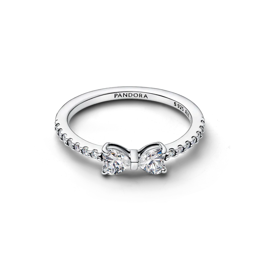 Embrace delicate design with the Sparkling Bow Ring. Two heart-shaped stones are set in the shape of a bow at the center of this sterling silver ring, which also features a row of pavé on the top half of the band. A sweet and feminine style, this bow-inspired ring is designed to be worn on its own for a minimalist look that speaks volumes.