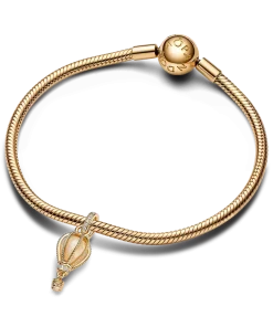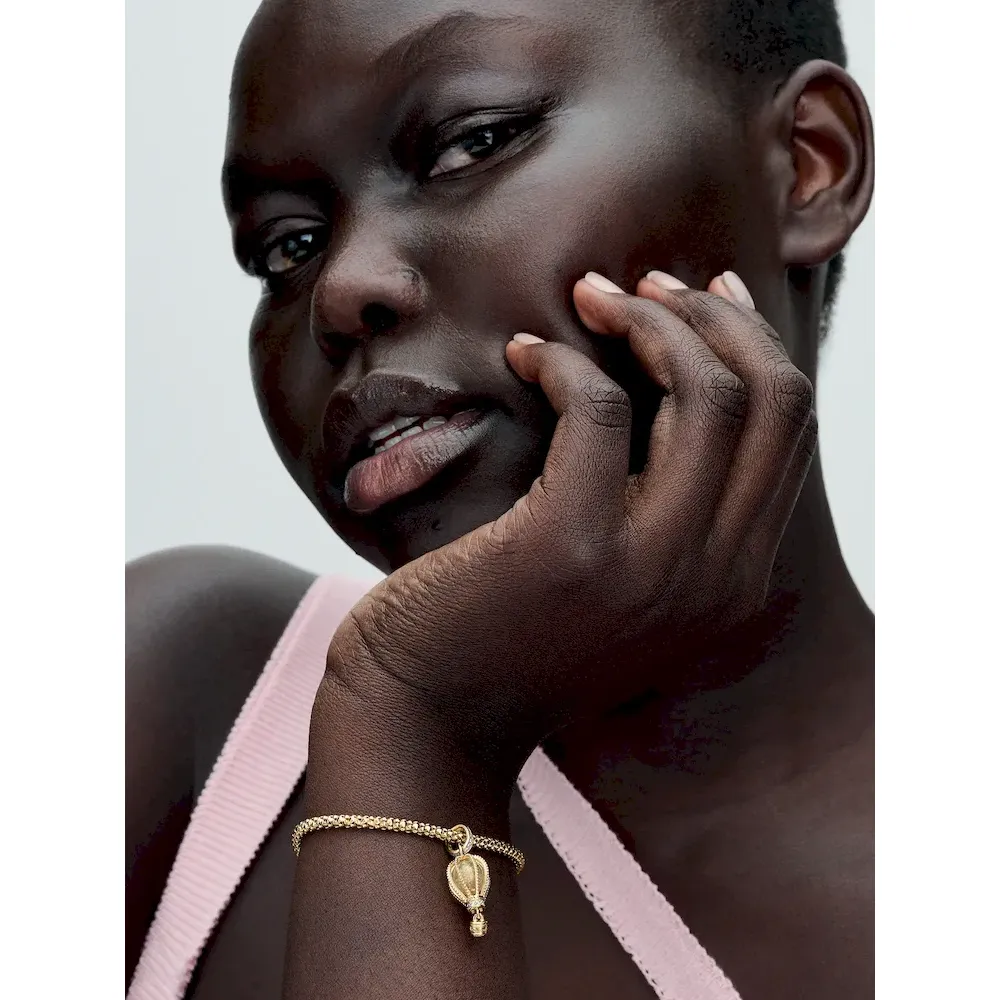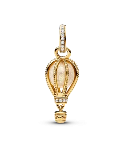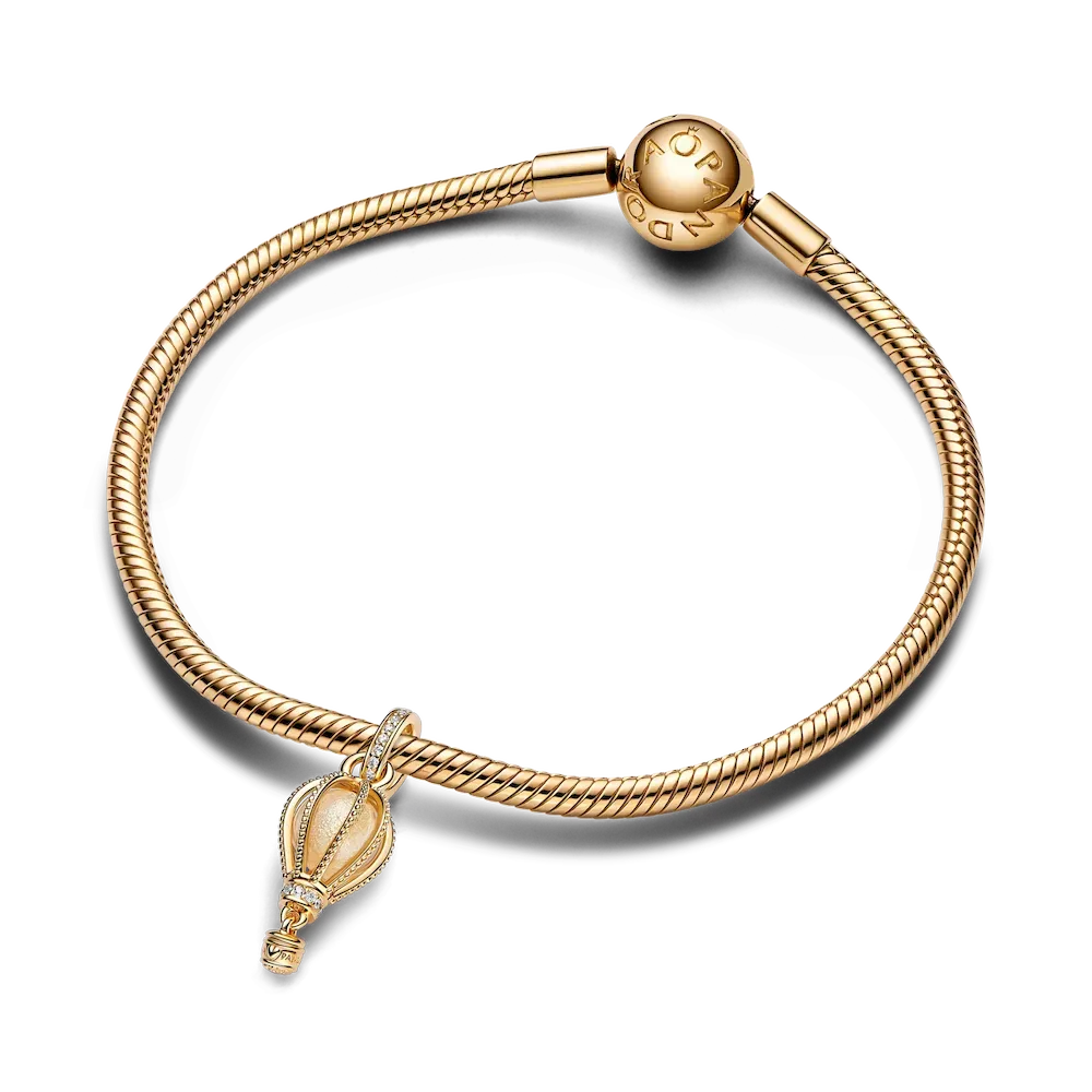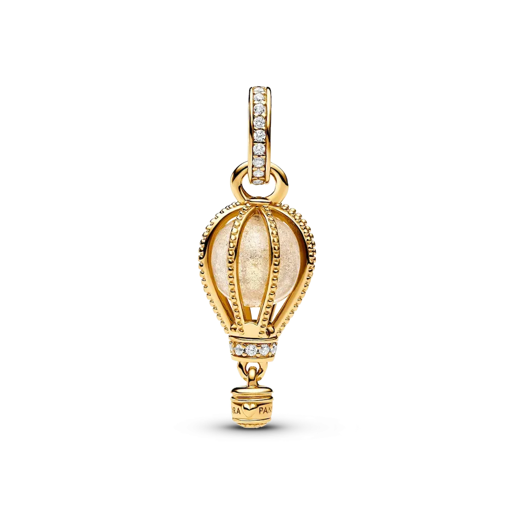 Reach new heights with the Sparkling Clear Hot Air Balloon Dangle Charm. This warm-toned charm is hand-finished in 14k gold plating. Beaded ropes encase a glittery transparent Murano glass, while the bail and base of the balloon are embellished with sparkling pavé. Below, a small gondola awaits to transport you to your destination. Wear it for daily inspiration or gift it to someone who is ready for their next adventure.